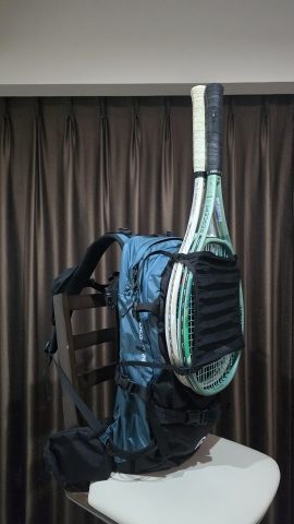 テニスラケット[YONEX/パーセプト100 G3]と[YONEX/ブイコア100 G3]の2本マウントも可能だがヘルメットアタッチメントの位置が上部なのでグリップ部分がかなり飛び出てしまいバランスが悪い。