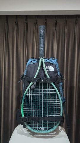 スノボアタッチメントに本来の用途であるスノボ、本来の用途ではないテニスラケットがマウントできるかを検証してみた。