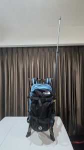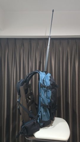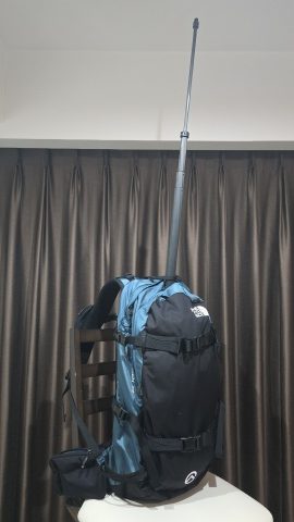 フロントパネルのアバランチポケットに[Insta360/超長い自撮り棒300cm]を挿しファスナーを締めてマウント。360°カメラを装着した状態で自撮り棒を最大長伸ばした状態での安定性には不安が残り。要事後検証。