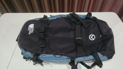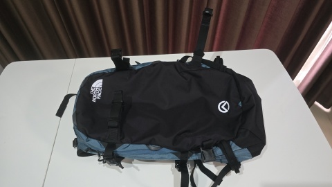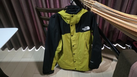 [TheNorthFace/マウンテンライトジャケットL]を畳んでマウント。ホールド感は弱いので移動中に抜け落ちるリスクがあるため、カラビナ留めをするか、別途収納袋に入れマウント後し更にカラビナで接続しが方が良い。