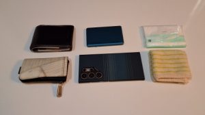[ダイソー/ペンケース2ポケット]にはマウントギア、携帯食料、モバイルバッテリー、マスク、ビニール袋。