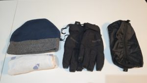 [無印良品/たためる仕分けケース 筒形 S]には予備のグローブとニット帽、タオル。