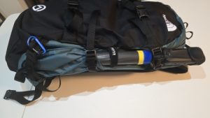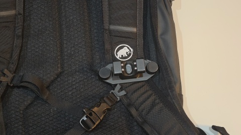 [MAMMUT/ニルヴァナ22L]の左ショルダーベルトに装着。右ショルダーベルトにも装着できるが前に使用した際に自撮り棒へのアクセスが難しいため今後使用しない。[THE NORTH FACE/チュガッチ28]のショルダーベルトは太すぎて装着できない。
