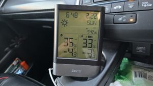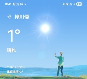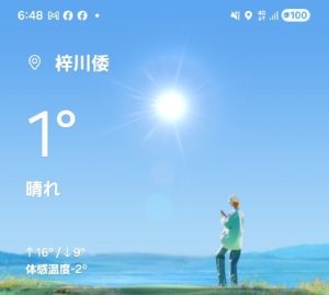 7時頃の車温度計は-4℃、スマホ現在地気温は1℃、車内温度は-4℃。今回も希釈ウォッシャー液は凍結して出てこず(´;ω;`)ウッ…。次回は忘れずに原液置換しとかないとダナ。