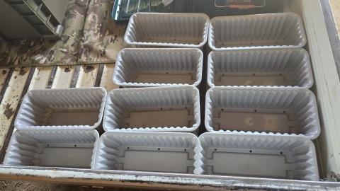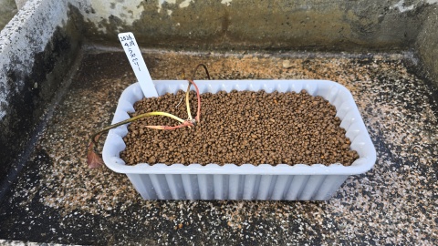 内鉢8個を[ダイライト/角型容器RL-500L]に沈める。水深が深いので浮葉の展開が遅いようなら底上げする予定。