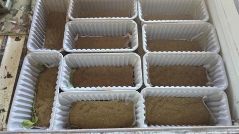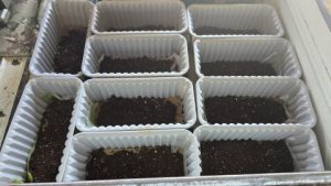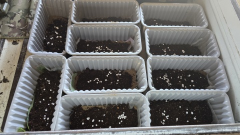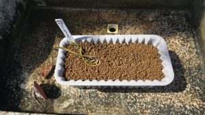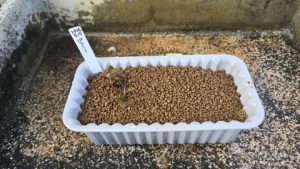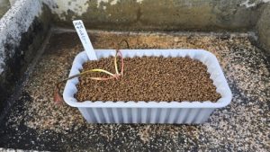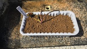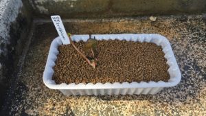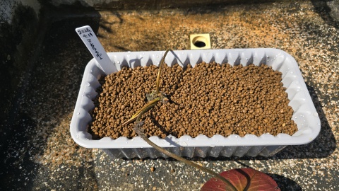 株分けした根茎を各内鉢に植付け[カインズ/赤玉土小粒]を敷き、水で湿らせラベリング。左は“ローズマグノリア”、右は“グレッグスオレンジビューティー”。