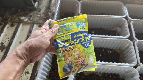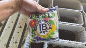 [花ごころ/IBのチカラ]、[ハイポネックス/マグァンプK大粒]を適当量埋め込む。用土量が少なめのため気持ち、元肥は多め。